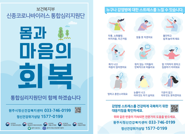 원주시 관계자는 “원주시민이 감염병 스트레스에 건강하게 대처할 수 있도록 다양한 방안을 마련해 적극 지원하겠다.”라고 말했다.