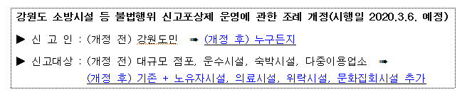 그동안 신고인은 강원도민으로 한정하고, 대상은 대규모 점포, 운수‧숙박시설, 다중이용업소로 운영해 왔으나,  금번에 화재위험요소를 사전에 적발하여, 화재등 재난발생시 인명피해를 줄이기 위해 조례를 개정, 모든 국민이 신고가능하고, 대상도 노유자 시설 등 4종을 추가 확대‧운영한다.