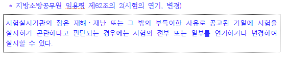 시험실시기관의 장은 재해・재난 또는 그 밖의 부득이한 사유로 공고된 기일에 시험을 실시하기 곤란하다고 판단되는 경우에는 시험의 전부 또는 일부를 연기하거나 변경하여 실시할 수 있다.
