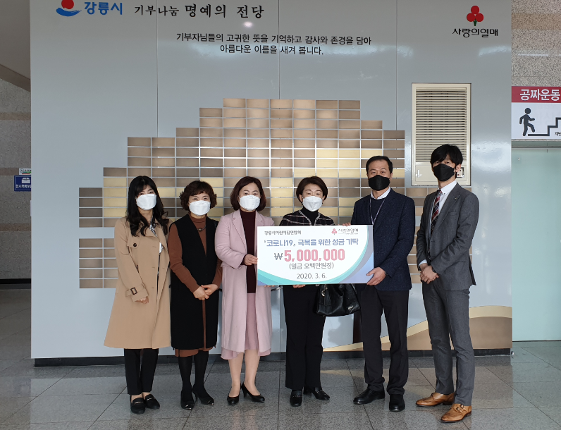강릉시어린이집연합회(회장 한동숙)는 6일 코로나19 확산 방지 및 피해지원을 위해 강릉시에 금5,000,000원(금오백만원)을 지정기탁하였다. 성금은 강원도사회복지공동모금회를 통해 현장의료진 및 취약계층에 전달될 예정이다.