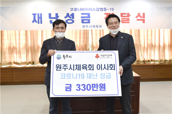 원주시 체육회 이사회(회장 이수영)는 3월 6일 원주시장 집무실에서 코로나19 성금 330만 원을 전달했다