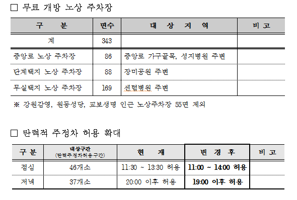 무료 개방 대상은 민간에 관리 위탁 중인 유료 노상 주차장 가운데 중심 상권인 단계택지, 무실택지, 중앙로 등 3개소 343면이다.