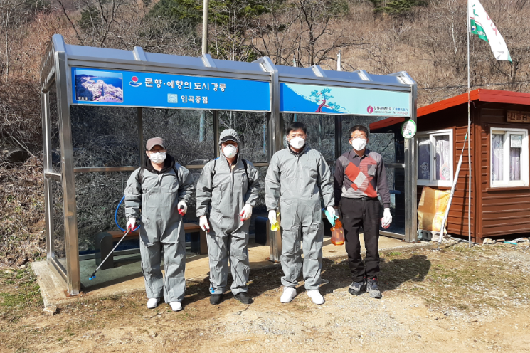 강릉시, 강동면 릴레이 방역단 시내버스 승강장 방역실시