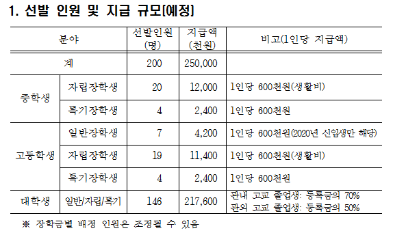 장학생 선발 기준은 공고일 현재 보호자가 3년 이상 계속해서 평창군에 주민등록을 두고 거주하고 있어야 하며, 자녀가 대학교(대학) 재학생 및 신입생, 강원도내 고등학교 재학생 및 신입생, 평창군 관내 중학교 재학생이다.