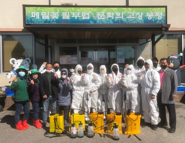 봉평면 번영회, 봉평면 이장협의회 등 봉평면내 8개 기관·사회단체가 모여 구성된 봉평면자율방역단은 코로나19 감염예방을 위해 3월 5일(목) 1차로 봉평면 공공시설 및 공중화장실을 중심으로 살균소독 방역활동을 펼쳤고, 금일 20여명이 참석하여 2차로 봉평면 시가지 일원에 추가 살균소독 방역을 실시하였으며, 향후 코로나19 사태의 추이에 따라 추가방역실시 및 소독제 배부 등 방역활동을 진행했다.