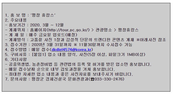 평창문화관광 홈페이지 온라인 마케팅 참여 업체 모집 (숙박업 및 카페)
