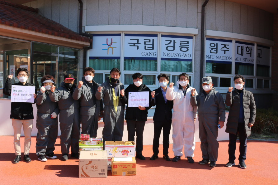 강릉시 사천면이장협의회(협의회장 : 박성호)는 정규민 시의원과 함께 지난 11일 사천면 관내에 소재한 강릉원주대 해양생물연구교육센터를 찾아 코로나19 확산방지를 위해 격리된 중국 및 대구유학생 22명에게 빵, 과일 등 위문품을 전달하였다.