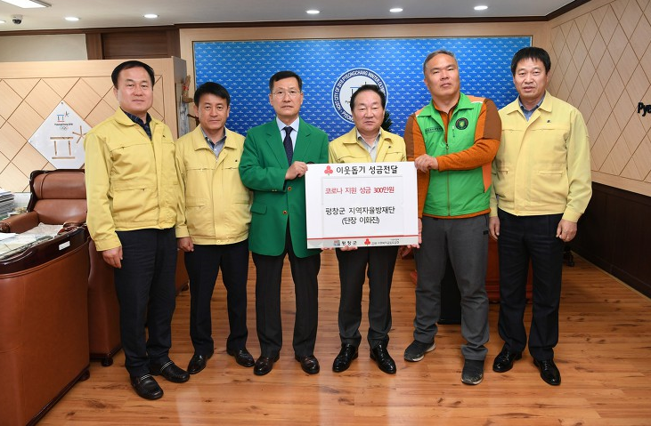 3월 13일(금) 평창군 지역자율방재단(단장 이화진)에서 평창군청을 방문해 코로나19 대응을 위해 써달라며 성금 300만원을 전달했다. 이화진 단장은“평창군의 코로나19 대응에 도움이 되고자 단원들이 힘을 모았다.”며“하루빨리 이 위기를 극복하여 안정된 사회가 찾아오기를 바란다.”고 전했다.