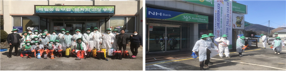 봉평남·녀새마을협의회(회장 이기철, 장미숙) 회원 30여 명이 참석하여 봉평약국, 농협하나로마트, 우체국 등 마스크 판매처와 봉평어린이집, 공중화장실 등 다중이용시설에 살균소독을 실시했다.