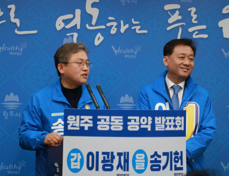 17일 오전 11시 원주시 갑 선거구 이광재 예비후보와 원주시을 선거구 송기헌 예비후보는 ‘혁신·기업도시가 살아야 원주 미래가 있다’를 주제로 공약을 공동발표했다.
