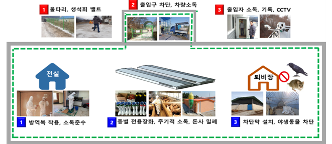우선, 군부대와 협조하여 접경지역 DMZ, 민통선 등 오염 지역에서의 위험요소 집중관리와 전파 매개체 유입 가능성이 있는 이동경로 전염요인에 대한 소독 등 방역관리를 강화하고, 양돈농장으로 유입방지를 위한 소독과 울타리 보완, 생석회 벨트, 기피제 설치 등의 차단방역 강화와 사육돼지는 물론 농장주변 야생동물 분변 등의 환경시료에 대한 상시예찰 검사도 확대할 예정이다.