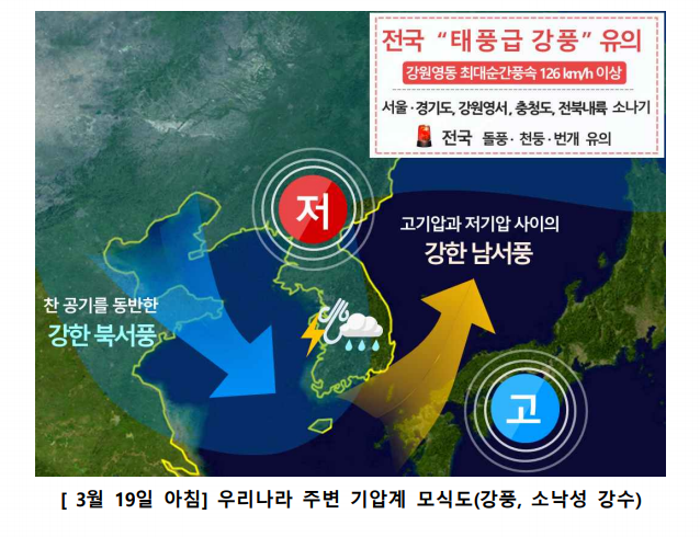 (유의사항) 매우 강한 바람으로 인해 선별진료소와 같은 야외에 설치된 천막이나 간판, 건축공사장, 철탑 등 시설물 관리와 안전 사고에 각별히 유의하기 바라며, 갑작스런 돌풍으로 인한 과수원 낙화 등 농작물 피해에도 대비하기 바랍니다. 또한 항공기 및 해상 선박 운항에도 차질이 있을 수 있으니 운항정보를 확인하기 바랍니다. 우리나라는 따뜻한 공기가 머무는 가운데, 19일 아침(06시)~ 낮(15시)에 북쪽으로부터 대기 상층(5km 상공 부근)의 영하 40도 이하의 찬 공기가 빠르게 남하하면서 대기가 매우 불안정해져 강원영서를 중심으로 돌풍과 천둥·번개를 동반한 소낙성 비가 내리겠습니다.