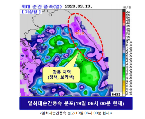 북한을 지나는 차가운 저기압과 우리나라 남동쪽의 따뜻한 고기압 사이에서 기압차가 커져 강원도는 내일(20일) 아침 까지 바람이 강하게 불겠고, 특히, 오늘(19일) 오후(18시)까지 최대순간풍속이 강원영동은 126km/h(35m/s) 이상, 그 밖의 강원영서에서도 90km/h(25m/s) 이상의 매우 강한 바람이 불겠다고 기상청은 밝혔다.