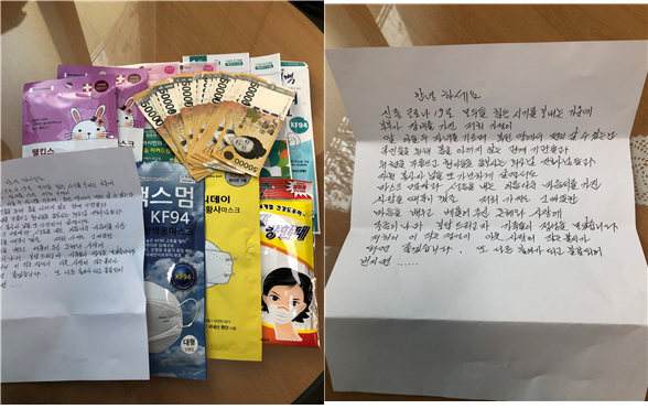 기탁자가 건넨 종이가방에는 마스크 뿐 만 아니라 현금 100만원과 편지한 장이 들어있었다.