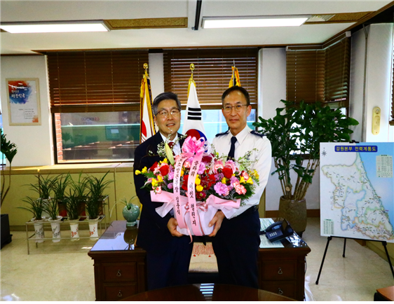 강원소방본부장은 지난 16일 15시에 최종태 강원도 농업기술원장으로부터 꽃바구니를 받았다. 김충식 강원소방본부장이 이봉희 한국전력공사 강원본부장 캠페인 후 코로나 19 극복 방안, 동해안 산불 예방대책, 도내 지역경제 살리기 현안 업무논의를 했다.