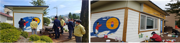 서양화가 권용택 평창미술인협회장(현 평창송어축제 홍보국장)은 배우자와 함께 반올림가게 외벽 그림 봉사를 실시했다.