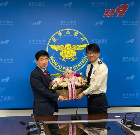 코로나19 사태로 큰 어려움을 겪고 있는 화훼농가를 돕기 위한 플라워 버킷 챌린지에 참여해 이병은 원주소방서장에게 꽃바구니를 전달했다.