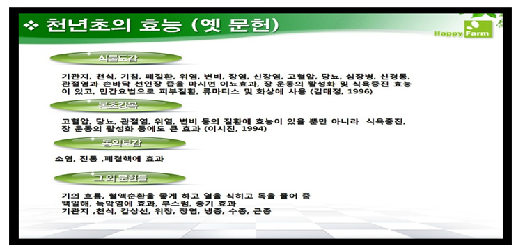 천년초는 염증을 가라앉히는 진정효과가 뛰어나며 기관지염, 속쓰림도 이른 시간 안에 진정된다. 특히 천년초는 영양 성분 면에서도 타 식물의 추종을 불허하는데, 식이섬유는 채소류의 9배, 곡물류의 6배, 비타민C는 오렌지보다 무려 24배나 많고, 불포화 지방산이 식품 중 가장 많다는 등푸른생선 고등어의 3배, 칼슘은 멸치의 7배, 우유의 24배나 많이 들어있는데 이 수치는 홍화씨(197mg/100g)의 18배에 해당한다. - 평창 유태평 천년초 대표 유시언 선생님 말씀 中-