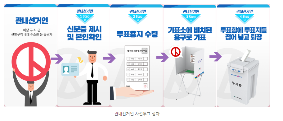 관내선거인, 관외선거인 모두 신분증(주민등록증, 운전면허증, 학생증, 여권 등)을 지참하고 가까운 사전투표소를 찾으면 된다.