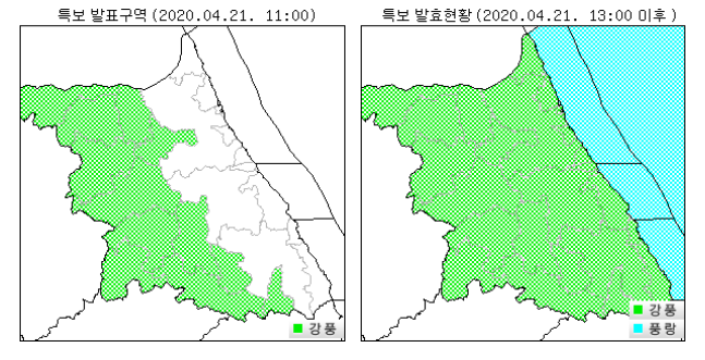 강원지방기상청은 21일 오후 1시 강원도 지역에 강풍주의보를 발표했다. 강풍주의보가 발효된 지역은 양구평지, 정선평지, 평창평지, 홍천평지, 인제평지, 횡성, 춘천, 화천, 철원, 원주, 영월, 태백 지역이다. 이 지역은 강풍특보가 발표된 가운데 바람이 점차 강하게 불고 있다.