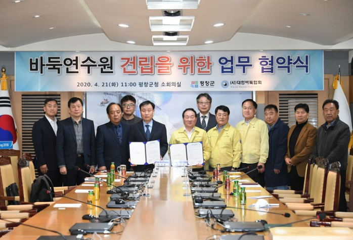 평창군(군수 한왕기)은 4월 21일(화) 11시 군청 소회의실에서 (사)대한바둑협회(회장:윤수로)와 바둑연수원 건립을 위한 업무협약을 체결했다.