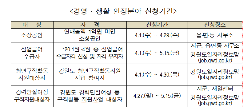 < 자세한 사항은 강원도청 홈페이지 ‘긴급생활안정 지원안내’ 참고 (강원도청 콜센터 ☎ 033-120)>