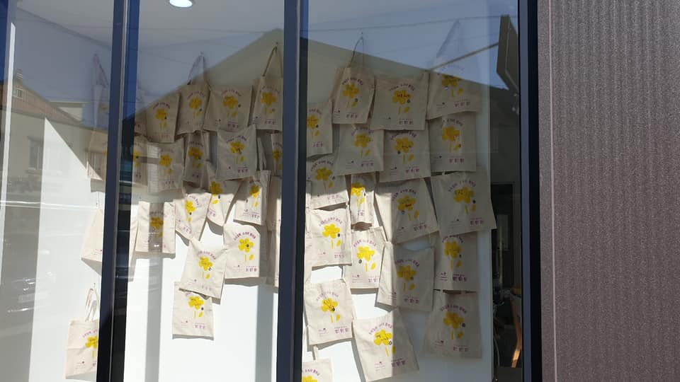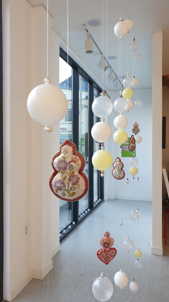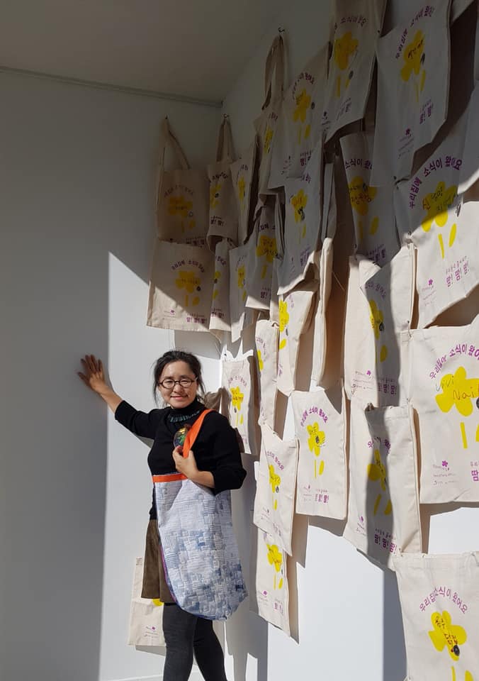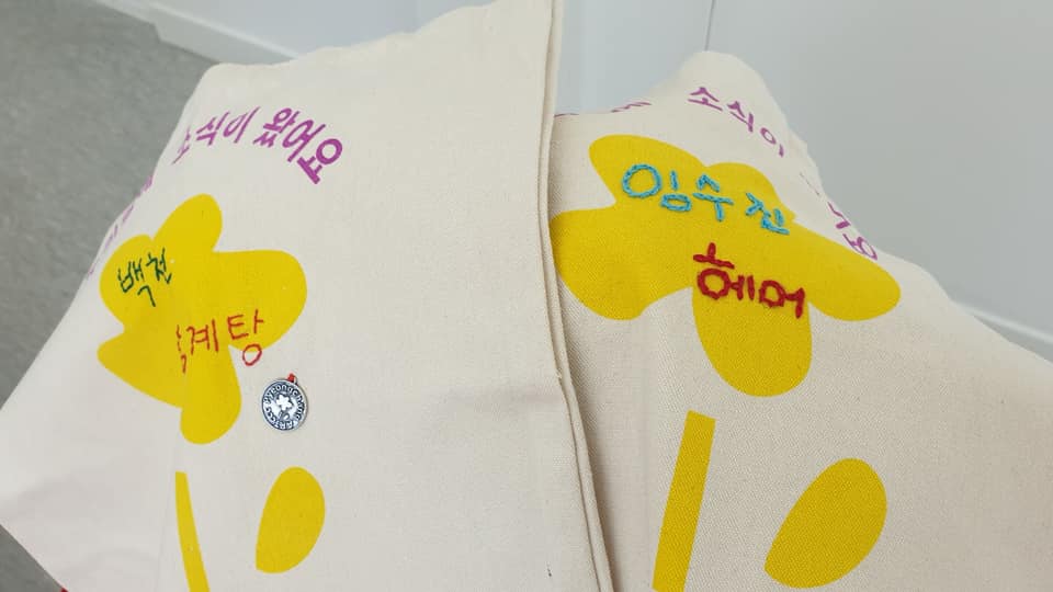각 가게 앞에 걸어서 우편물 등을 받을 수 있는 가방으로 만들어서 두어 달 전시를 했지요. 새해가 되면서 그 가방에 복주머니를 달아서 나눠드렸어요. 그런데 작업하고 전시하던 2~3월 사이에 가게가 문을 닫거나 주인이 바뀐 곳이 있어서 아쉬웠지요. 한편으론 바로 앞 식당에 밥을 먹으러 갔는데, 입구에 그 소식가방이 걸려있어서 기분이 너무 좋았어요.