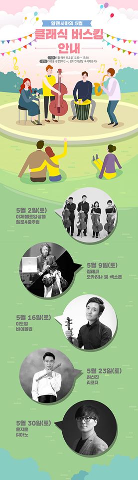 공연은 매주 다른팀이 진행될 예정으로 5월2일 이제첼로앙상블 첼로4중주팀 / 5월9일(토) 정태규 오카리나 및 색소폰 / 5월16일(토)이도영 바이올린 / 5월 23일(토) 최선진 리코더 / 5월30일(토) 윤지훈 피아노 팀이 차례대로 진행될 예정이다.
