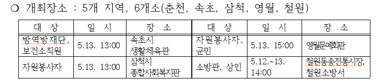 강원도는 신종 코로나바이러스 감염증(코로나19)의 위기 속, 본연의 분야에서 위기극복을 위해 노력해 주신 기관을 방문, 도민을 대표하여 감사의 마음을 전하는「찾아가는 힐링음악회」를 5월 12일부터 5월 13일 2일간의 행사를 시작으로 단계별로 추진한다.