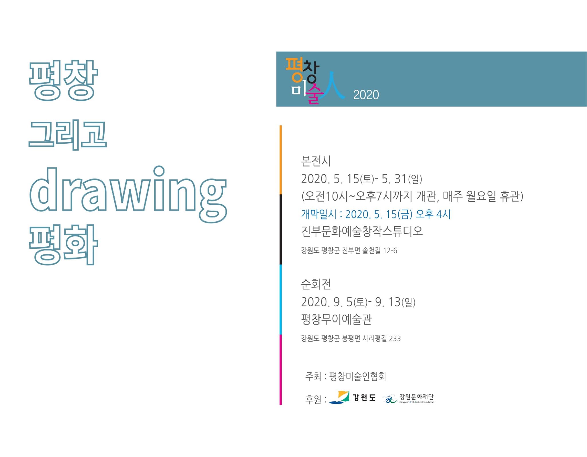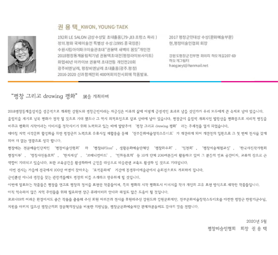 평창미술인 협회가 주최하고 강원도와 강원문화예술재단이 후원하는 이번 전시회는 ‘평창 그리고 drawing 평화’라는 주제로 개최된다.