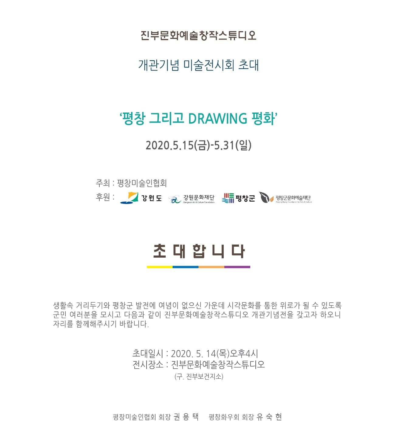 평창군 미술인협회(회장 권용택)는 진부문화예술창작스튜디오에서 개관기념 전시회 ‘평창 그리고 DRAWING 평화’를 개최한다고 밝혔다. (구)진부보건지소 건물이었던 이곳은 지역 사각 문화 활성화를 위한 평창군의 노력으로 유휴 시설 재활용을 통해 새롭게 개편된 곳이다.