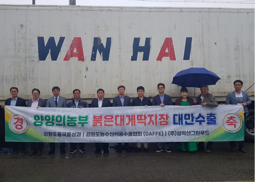 강원도 양양군 양양읍에 위치한 도내 농수산식품 수출기업인 “농업회사법인 ㈜설악산그린푸드”는 지난 5월 15일 속초 대포 농공단지 한백푸드 내에서 강원도 중국통상과장, (사)강원도농수산식품 수출협회장 박승인, 농업회사법인 ㈜설악산그린푸드 함승우 대표  등이 참석한 가운데 “(상품명) 양양의 농부 속초 붉은대게 딱지장 80g“ 대만 수출 선적행사를 가졌다.
