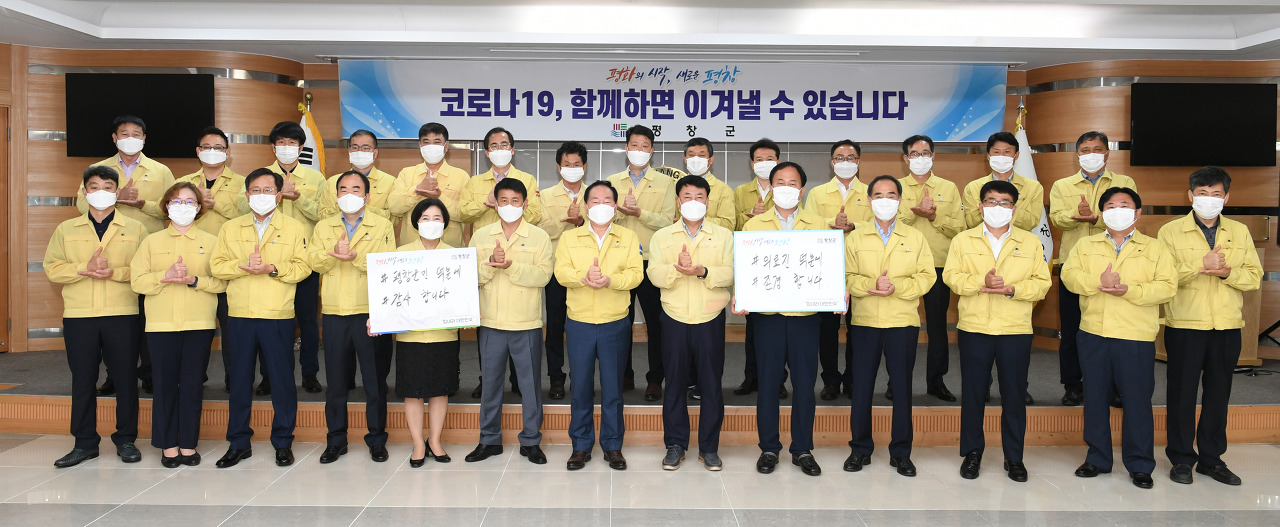 평창군은 5월 18일(월) 군청 대회의실에서 평창군수 외 25명의 간부공무원이 모인 가운데‘코로나19 극복 희망캠페인 릴레이’에 동참했다고 밝혔다.