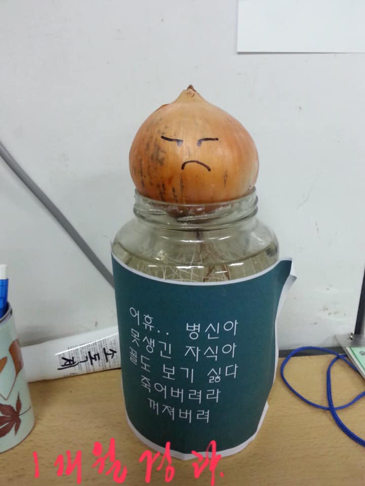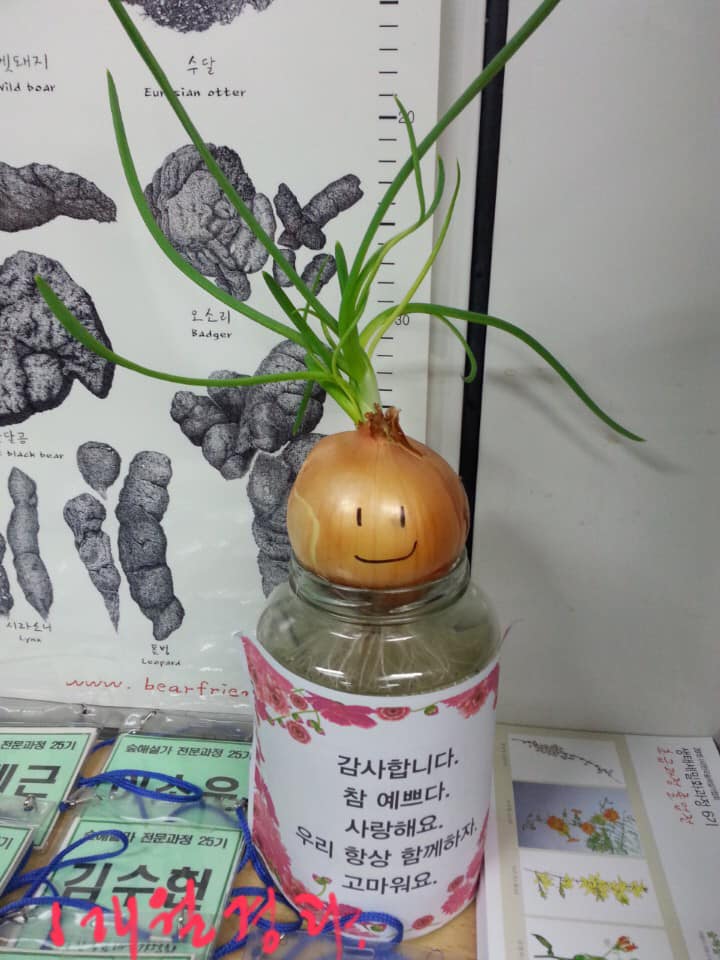 최소한 반년 이상 함께 수업하는 어린이들을 대상으로 양파 두 개를 똑같은 병에다 같은 환경에서 키우면서 한쪽에는 아주 사랑스러운 문구를, 한쪽에는 부정적인 문구를 만들어서 붙이고 어린이들에게 만날 때마다 큰소리로 주문을 크게 다섯 번씩 외치게 했다.
