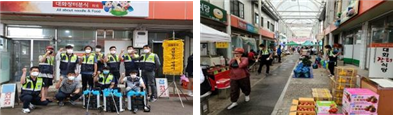 대화자율방범대(대장 김종구)에서는 회원 11명이 참석한 가운데 시장을 방문하는 지역주민에게 생수를 나눠드리고, 손소독제 사용을 권장하는 코로나 예방 캠페인을 진행하였을 뿐 아니라 대화시가지, 전통시장 안 곳곳을 방역 소독했다.