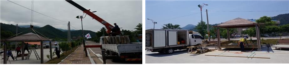 대화1리 마을회관의 낡은 정자각을 수리하기 위해 행운산업(대표 안귀석)에서는 대화1리 마을회관 정자각 이동설치에 따른 크레인, 인력지원을 해주었을 뿐 아니라, 예목(대표 선경용)에서는 마을회관 정자각 마루, 발판을 제작해 주는 재능기부를 실천하였다.