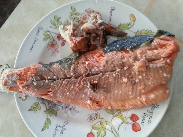 펜션 손님께서 낚시로 잡으셨다는 메기 두 마리를 들고 오셔서 한 마리는 석쇠에 소금구이로 반 마리는 매운탕 끓이시고 반 마리를 주셨다크기가 크니 입도 엄청 크다.