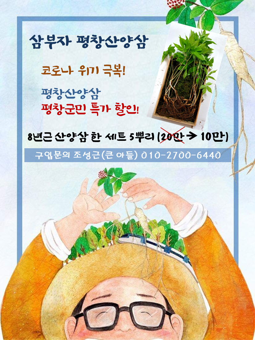 삼부자 평창 산양삼은 아버지, 저(큰아들), 동생 삼부자가 함께 삼을 키우고, 또 삼이 많다 하여 삼부자라고 이름을 지었습니다. 아버지는 21년 경력에 심마니 시고, 동생은 봉평면에서 ‘대림장’이라는 산양삼 백숙집을 하고 있습니다.