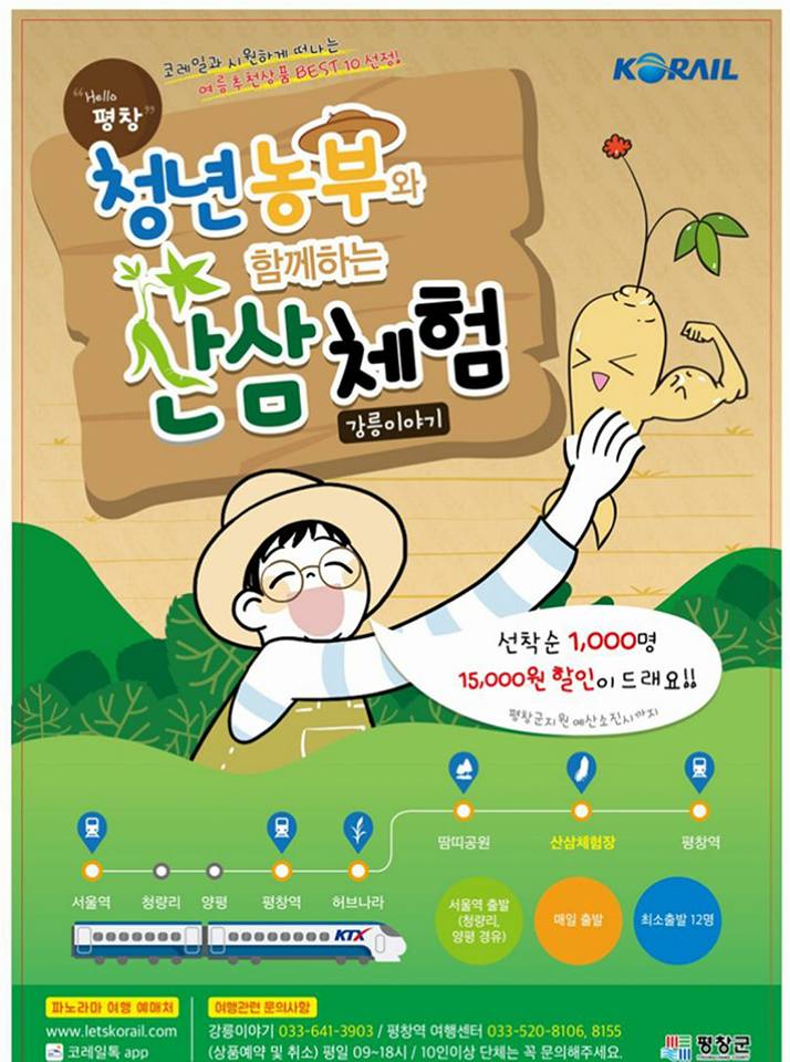 본격적으로 하게 된 것은, 20018년부터 KTX 평창역 여행센터와 함께한 산양삼 체험이 그 시작이었습니다. 산에서 직접 산양삼을 캐고, 담금주를 담가 가며, 산양삼 백숙을 즐길 수 있는 프로그램이었습니다. 지금은 평창역 대표 체험상품으로 선정이 되었고요.