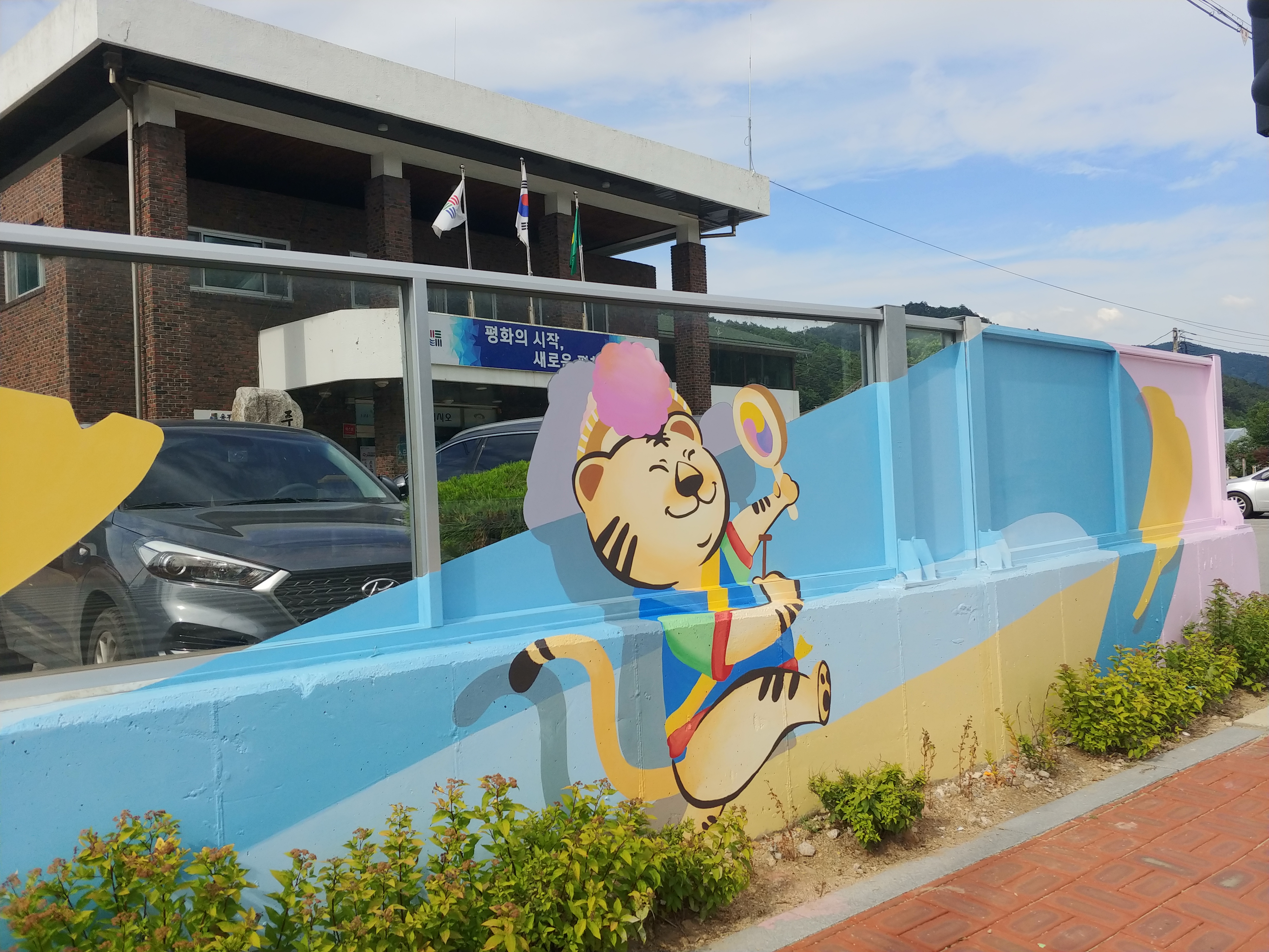 용평면사무소는 6번, 31번 국도 옆에 위치해 있어 국도를 이용하는 차량과 면사무소를 방문하는 마을 주민의 통행이 다른 지역에 비해 많은 곳으로, 기존 단순한 투명 방음벽면에 평창둔전평농악회의 캐릭터를 활용, 바탕 도색 및 벽화 채색 처리를 통해 보다 산뜻하게 개선하였다.