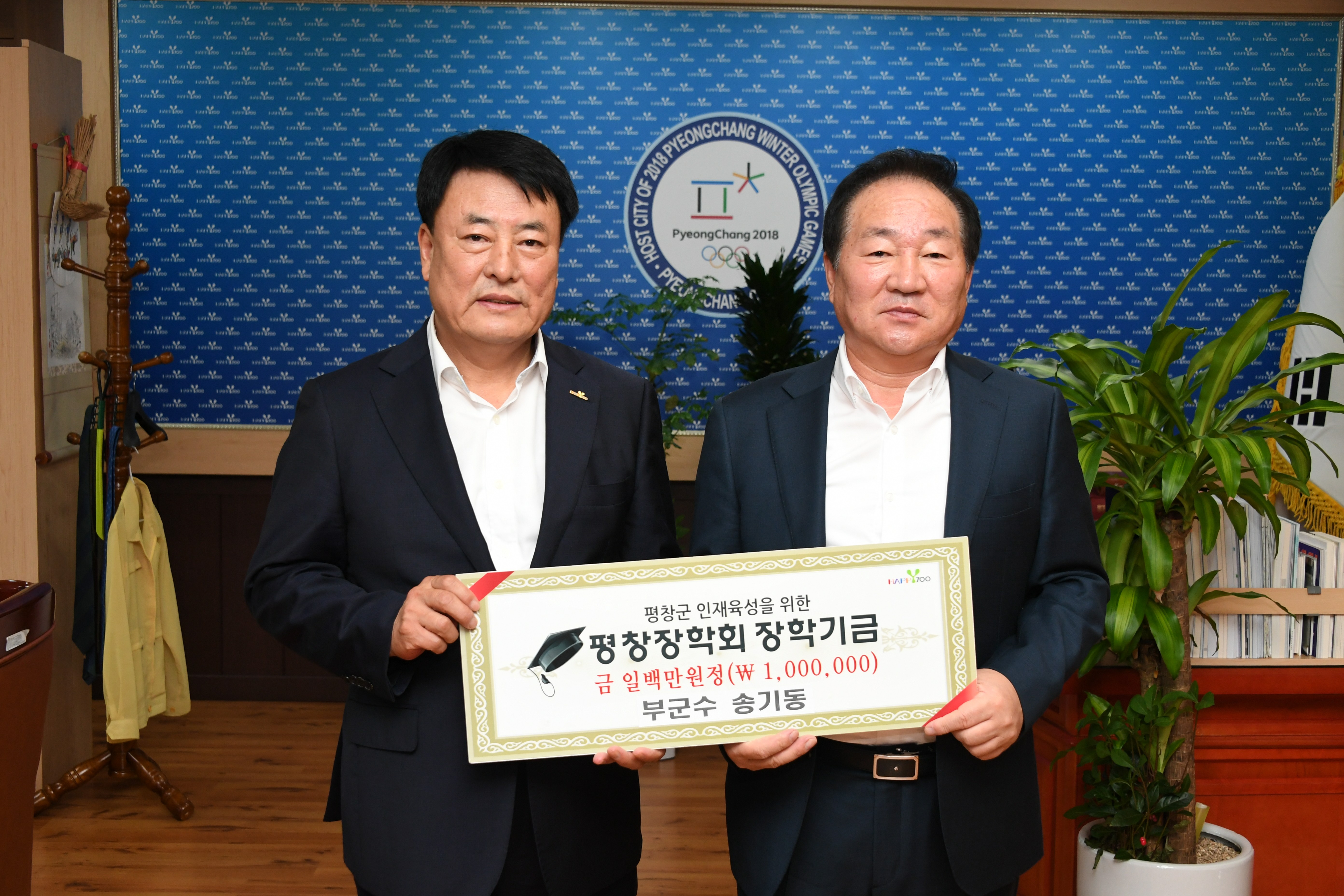 (재)평창장학회(이사장 한왕기)는 송기동 평창부군수가 지역 인재양성에 써달라며 장학기금 100만원을 기탁했다고 30일 밝혔다.