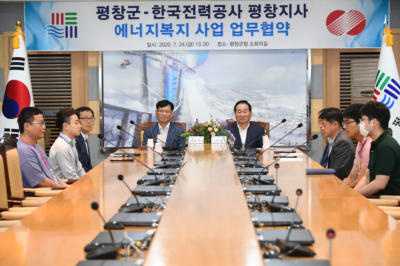 평창군은 7월 24일(금) 13시 20분 평창군수 집무실에서 한왕기 평창군수와 이범용 한국전력공사 평창지사장 및 관계자들이 참석한 가운데 한국전력공사 평창지사와 농촌지역 에너지복지 향상을 위한 에너지복지 사업 업무협약을 체결했다.