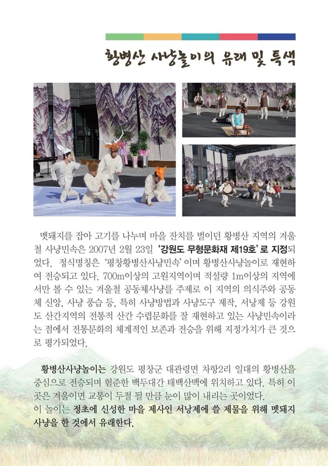 평창황병산사냥민속보존회(회장 최종근)는 8월 6일(오후 4시), 7일(오후 7시) 이틀간 ‘알펜시아 시네마’에서 마당극 ‘황병산에 멧돼지 잡으러 가세~’를 선보인다.