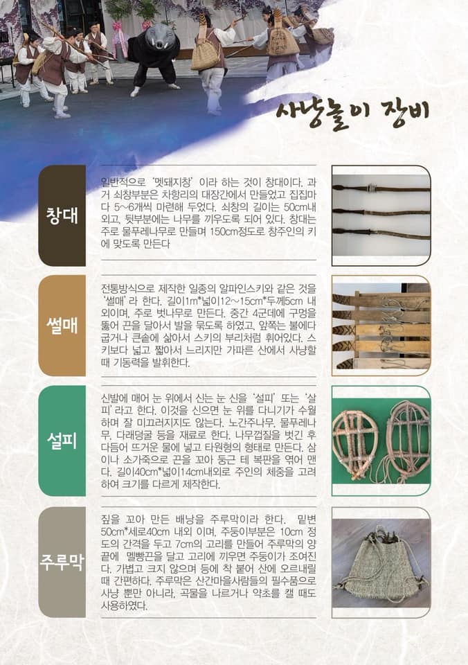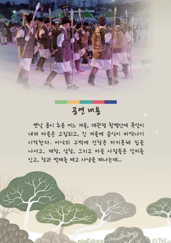 2019년 처음 기획공연으로 제작한 이 마당극은 기존 무형문화재의 전통적인 형태에서 벗어나 관객들이 이해하기 쉬운 이야기로 구성되었고, 유머와 해학이 가미되어 보는 이들에게 대관령의 ‘수렵전통문화’에 대한 이해와 즐거움을 함께 주는 공연으로 펼쳐진다.