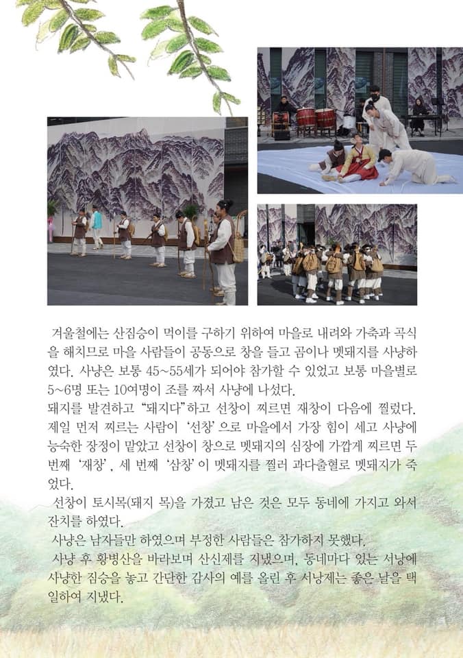 2019년 처음 기획공연으로 제작한 이 마당극은 기존 무형문화재의 전통적인 형태에서 벗어나 관객들이 이해하기 쉬운 이야기로 구성되었고, 유머와 해학이 가미되어 보는 이들에게 대관령의 ‘수렵전통문화’에 대한 이해와 즐거움을 함께 주는 공연으로 펼쳐진다.