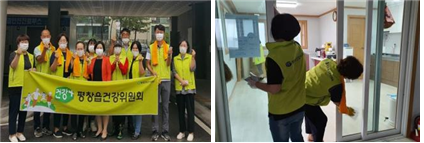 평창읍건강위원회(회장 함영예) 회원 10명은 코로나19 감염 우려로 폐쇄하였다 7월말 운영을 재개한 관내 경로당 6(1/2, 종부 1/2/3, 2)을 방문해 방역 봉사 활동을 실시하였고 덕분에 어르신들은 건강하고 안전하게 생활하실 수 있게 되었다.