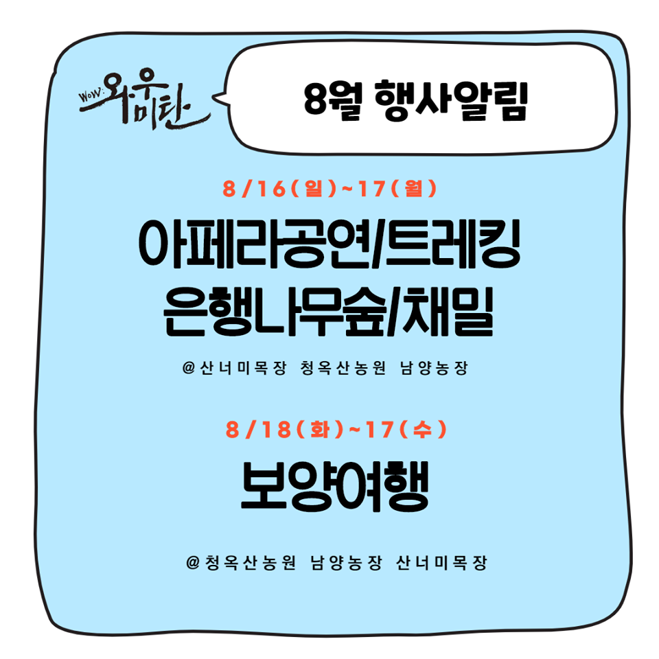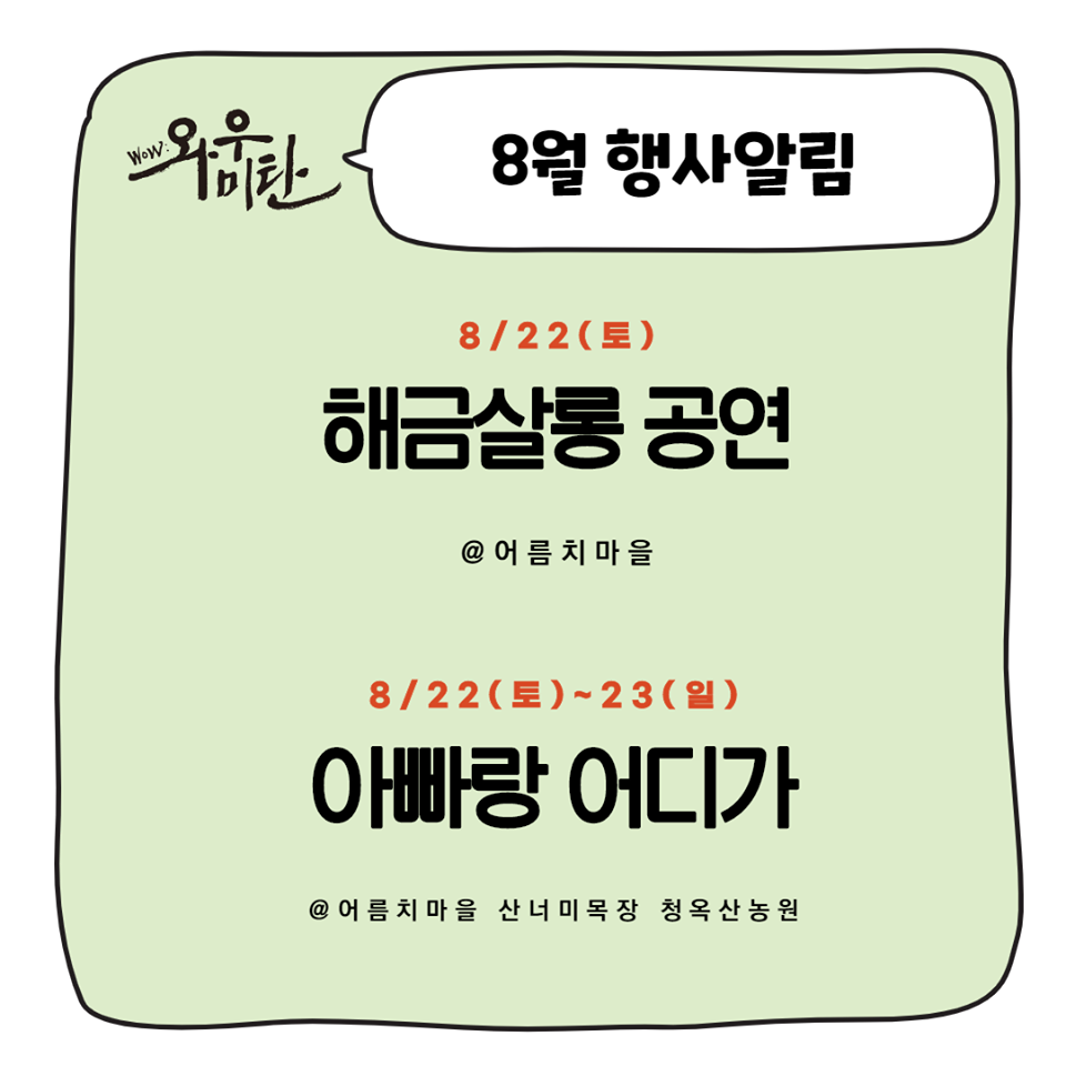 8월 22일 토요일에는 어름치 마을에서 해금살롱의 공연이 예정되어 있다. 22,23일 이틀간은 어름치마을, 산너미목장, 청옥산 농원에서 '아빠어디가' 체험프로그램이 가능하다.