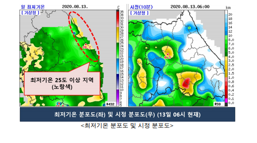 밤사이 북태평양고기압의 가장자리를 따라 고온다습한 남서풍이 유입되는 가운데 흐린 날씨가 유지되고, 강원동해안( 강릉, 양양)에는 어제(12일) 오후에 오른 기온이 충분히 내려가지 못해, 열대야가 나타난 곳이 있다.