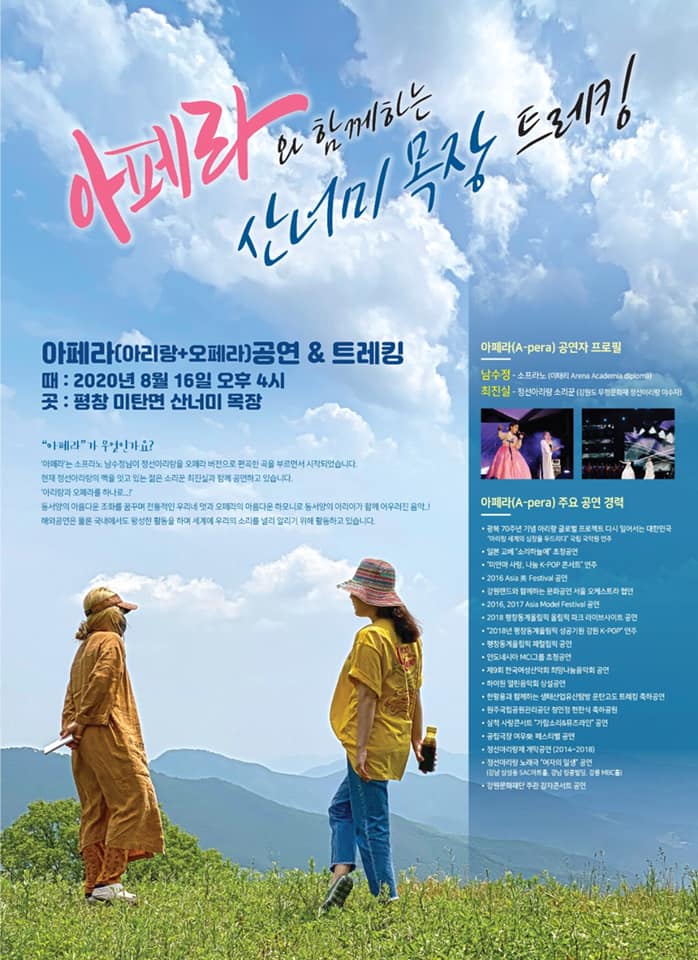 WOW미탄 청년들이 기획한 체험 및 공연프로그램이 이번주로 다가왔다. 첫번째 순서로 오는 16일 산너미 목장에서 아페라(아리랑과 오페라가 혼합된 공연) 공연이 진행될 예정이다. 아페라는 아리랑과 오페라의 합성어로 정선아리랑 소리꾼 최진실씨와 소프라노 남수정이 함께 공연한다. 또 청옥산 농원에서는 은행나무숲 체험과 남양목장에서 채밀체험이 진행될 예정이다.