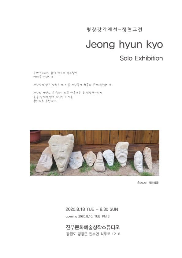 진부출신 조각가 정현교의 개인전이 진부 문화예술창작스튜디오에서 열린다. 정현교 작가는 고향인 평창의 강에서 돌을 수집하고 그 위에 작품 활동을 해 오고 있다. 평창군은 그동안 수많은 명석이 출토된 애석 문화의 중심지역으로 전국 각지의 수석 애호가들에게 사랑받는 고장이기도 하다. 조각가 정현교는 작품 전시회를 열며 다음과 같이 소회를 밝혔다.